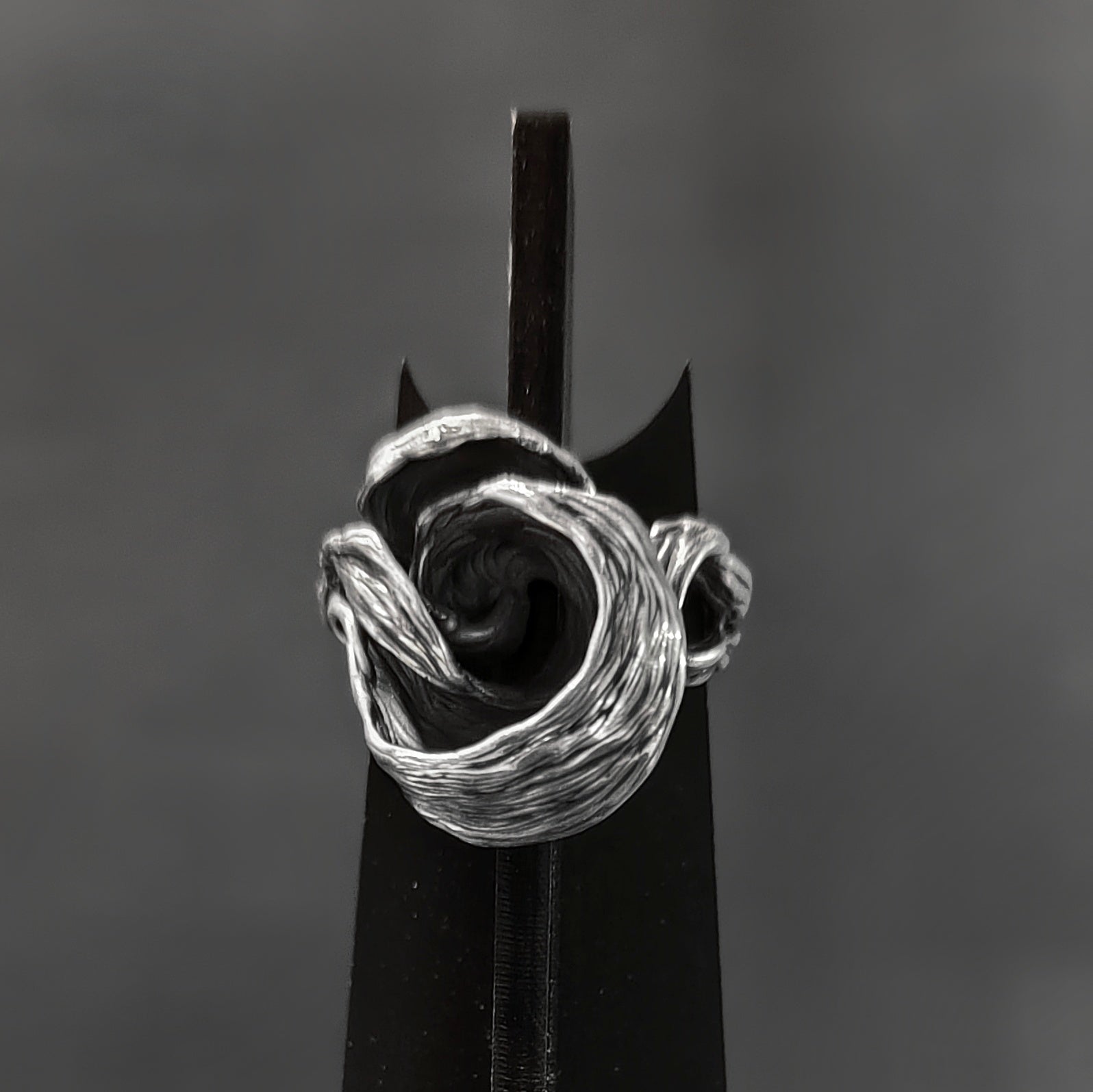 This piece is meticulously hand-carved using the wax carving technique and cast in 925 sterling silver with an oxidized finish.